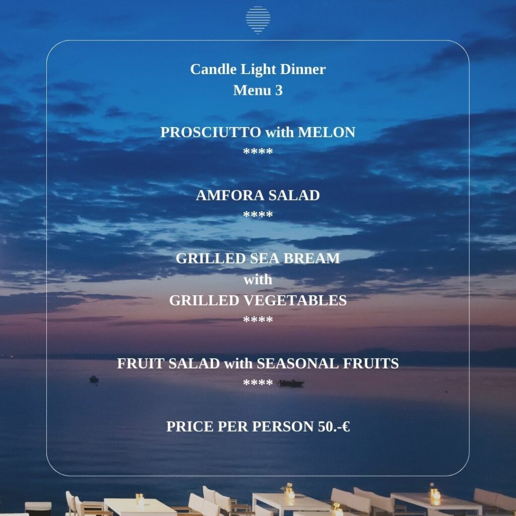 Enjoy your breakfast in the rich buffet of Amfora restaurant by the sea. Choose between pancakes, sweets, omelettes, dairy products, porridge, muesli, fruits, vegetables and explore flavors from a Greek, authentic breakfast with local fresh ingredients.