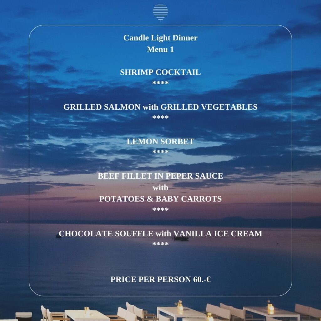 Sophisticated dishes from local ingredients, fresh seafood as well as selective high gastronomy suggestions are waiting for you to discover. Τhe journey of flavors continues in the bar of the restaurant which has a wide variety of drinks and cocktails. Enjoy your drink or cocktail with an endless view to the sea of Polychrono.